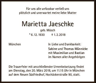 Wir trauern um Frau Marietta Jaeschke geb. Müsch Hausfrau * 06.12.1930 † 01.02.2018 |
