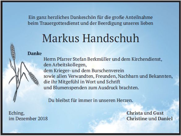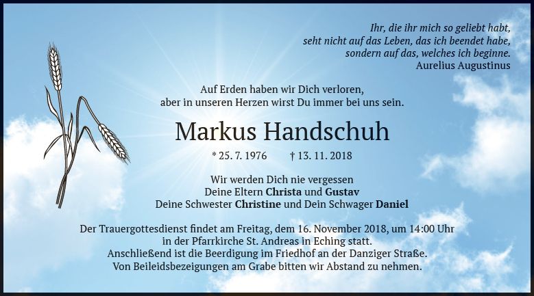 Gottesdienst am Freitag, dem 16. November 2018, um 14:00 Uhr in St. Andreas - Neu in Eching Anschließend Beerdigung am Freitag, um 14:45 Uhr im Friedhof Eching an der Danziger Straße
