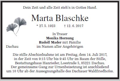 Die stille Verabschiedung ist am Freitag, dem 14. Juli 2017, zwischen 9:15 Uhr und 9:45 Uhr im Raum der Stille, Hanrieder Bestattungshaus, Loestrasse 5, Dachau. |