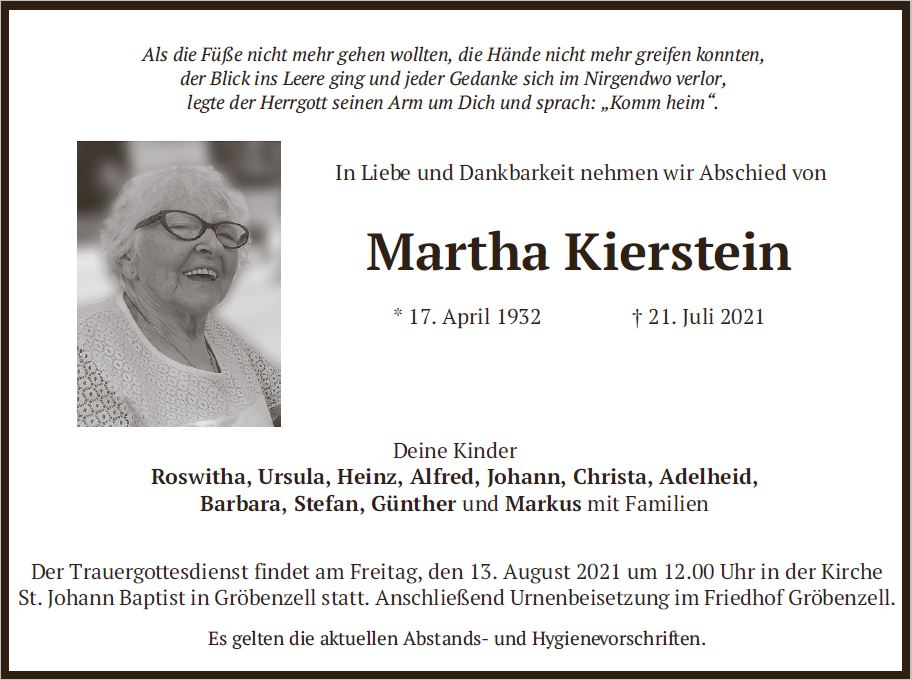 Wir trauern um Frau Martha Kierstein geb. Stirner * 17.04.1932 † 21.07.2021 |