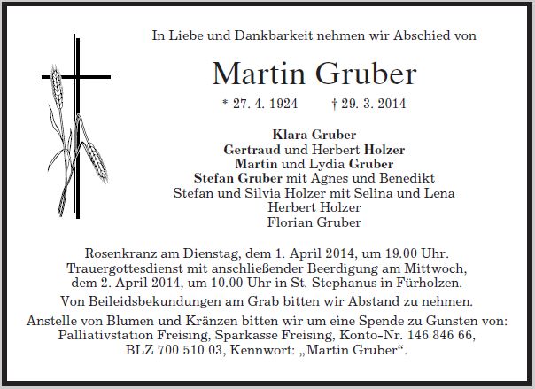 Gottesdienst mit anschließender Beerdigung am Mittwoch, dem 02.04.2014 um 10:00 Uhr in St. Stephanus in Fürholzen