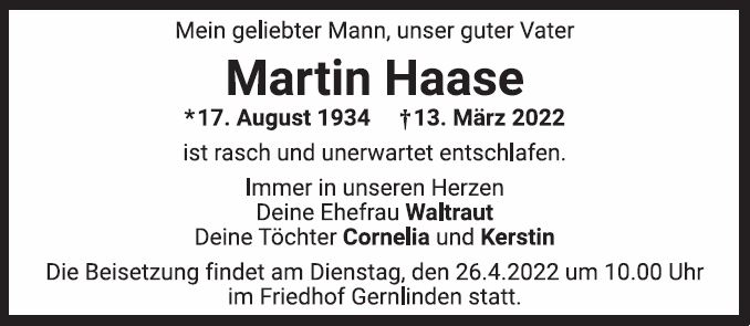 Die Beisetzung findet am Dienstag, den 26. April 2022 um 10:00 Uhr im Friedhof Gernlinden statt.