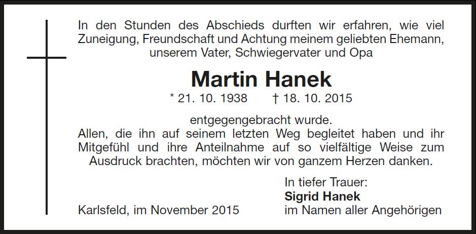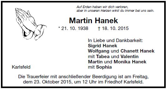 Wir trauern um Herrn Martin Hanek Kraftfahrer * 21.10.1938 † 18.10.2015 |
