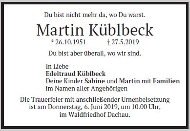 Die Trauerfeier mit anschließender Urnenbeisetzung ist am Donnerstag, dem 6. Juni 2019, um 10 Uhr im Dachauer Waldfriedhof. |