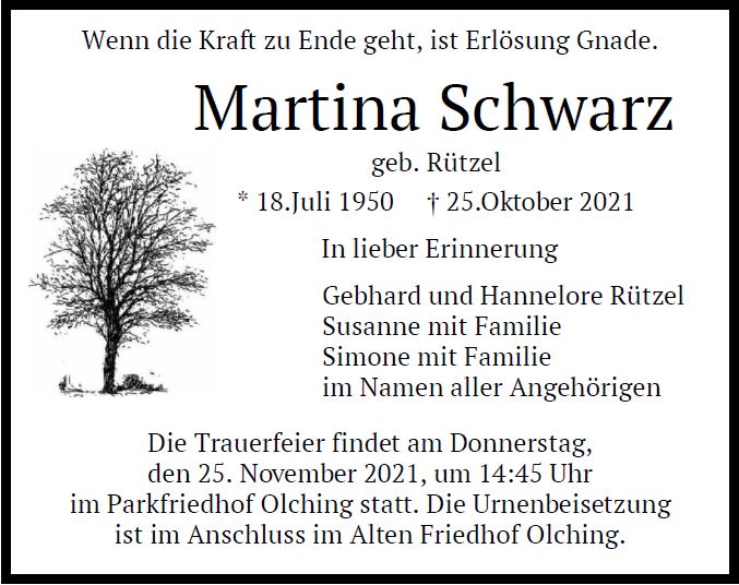 Wir trauern um Frau Martina Schwarz geb. Rützel * 18.07.1950 † 25.10.2021 |