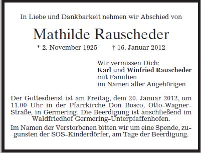 Wir trauern um Frau Mathilde Rauscheder geb. Sendbühler Bankkauffrau * 02.11.1925 † 16.01.2012 |