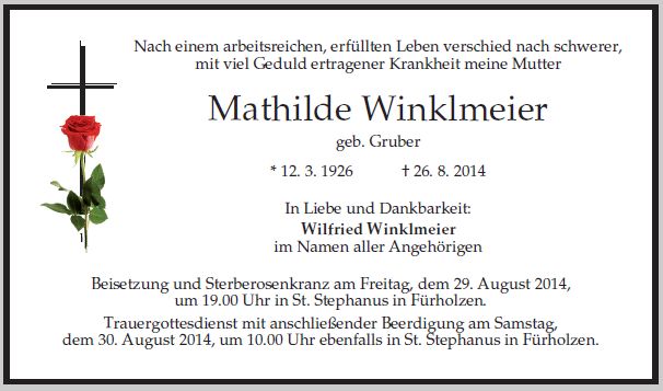 Gottesdienst mit anschließender Beerdigung am Samstag, dem 30. August 2014, um 10:00 Uhr in St. Stephanus in Fürholzen.
