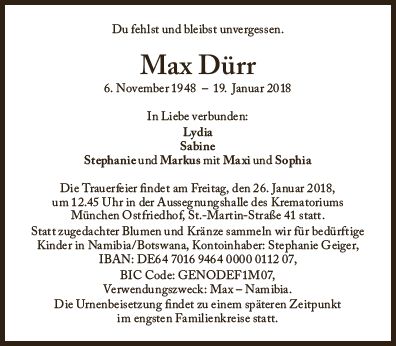Statt zugedachter Blumen und Kränze sammeln wir für bedürftige Kinder in Namibia/Botswana; Kontoinhaber: Stephanie Geiger; IBAN: DE 64701694640000011207