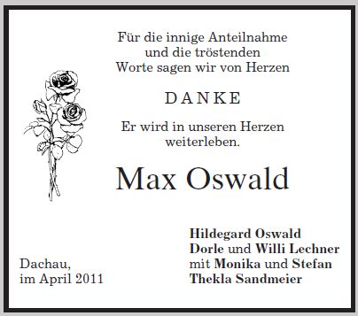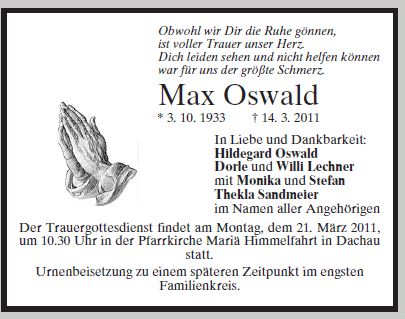 Gottesdienst am Montag, dem 21. März 2011, um 10:30 Uhr in Mariä Himmelfahrt in Dachau Die Urnenbeisetzung erfolgt zu einem späteren Zeitpunkt im engsten Familienkreis.
