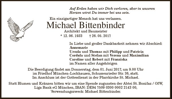 Gottesdienst am Donnerstag, dem 1. Juni 2017, um 10:00 Uhr in St. Michael Beerdigung am Donnerstag, dem 1. Juni 2017, um 09:00 Uhr im Friedhof Lochhausen