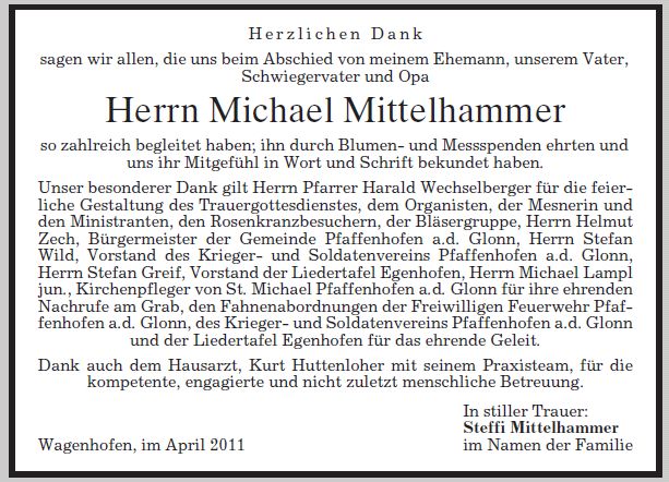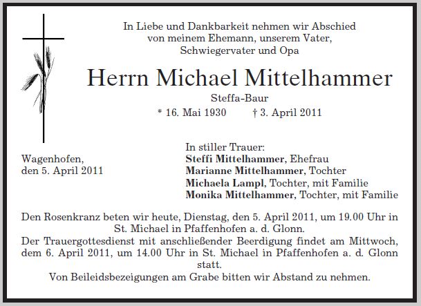 Gottesdienst mit anschließender Beerdigung am Mittwoch, dem 6. April 2011, um 14:00 Uhr in St. Michael Pfaffenhofen a.d. Glonn