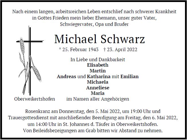 Wir trauern um Herrn Michael Schwarz * 25.02.1943 † 23.04.2022 |