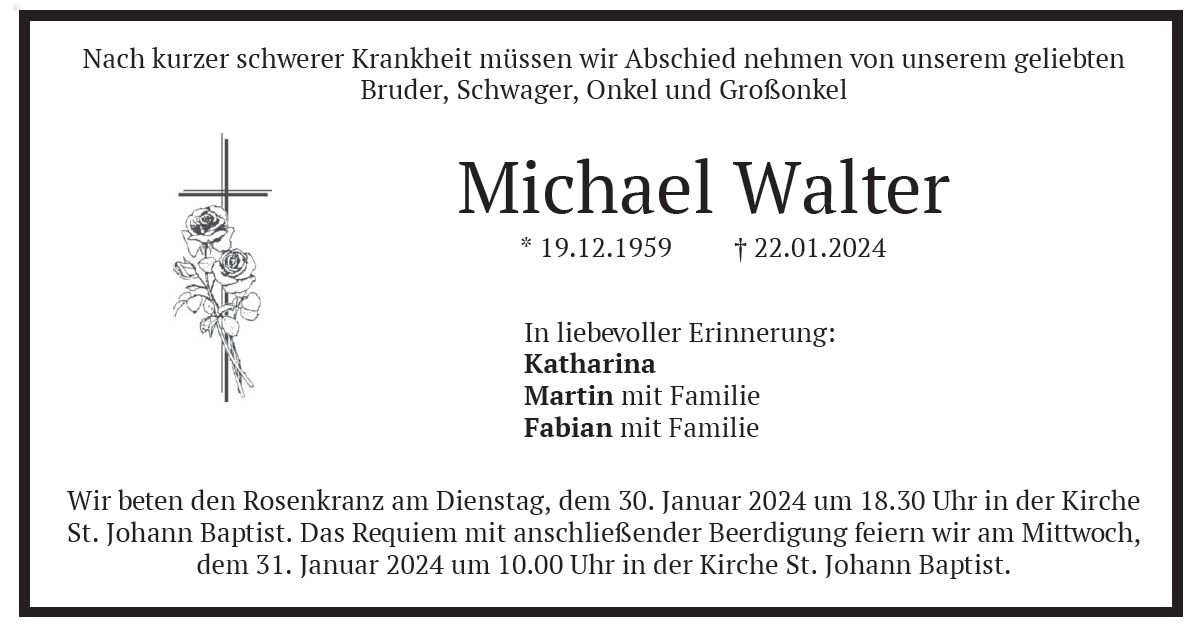 Requiem am Mittwoch, dem 31. Januar 2024, um 10:00 Uhr in St. Johann Baptist, Bergkirchen. Die Beerdigung findet im Anschluss statt.