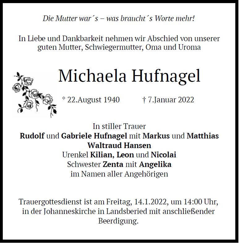 Trauergottesdienst ist am Freitag, 14.1.2022, um 14:00 Uhr, in der Johanneskirche in Landsberied mit anschließender Beerdigung.