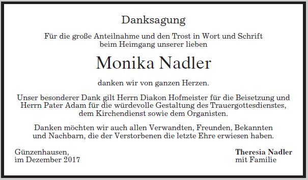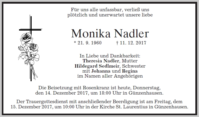 Die Beisetzung mit Rosenkranz ist am Donnerstag, dem 14. Dezember 2017,um 18:00 Uhr in Günzenhausen. |