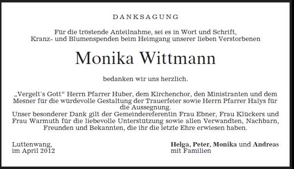 Gottesdienst am Mittwoch, dem 11. April 2012, um 14:00 Uhr mit anschließender Beerdigung in Luttenwang