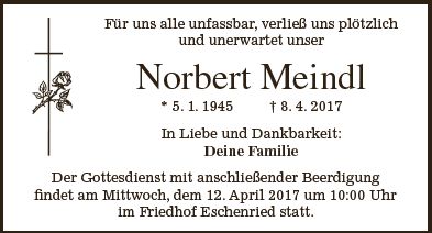 Gottesdienst mit anschließender Beerdigung am Mittwoch, dem 12. April 2017, um 10:00 Uhr im Friedhof Eschenried