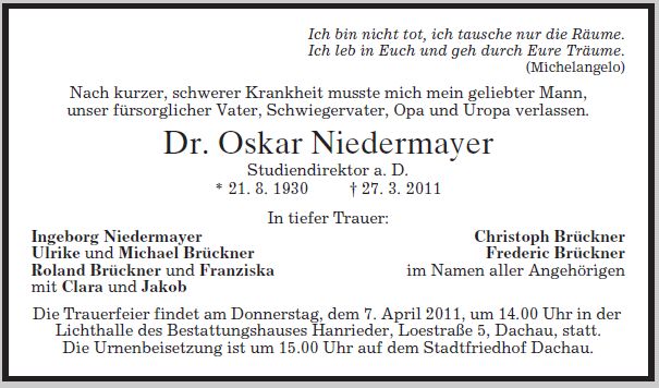 Wir trauern um Herrn Dr. Oskar Niedermayer Studiendirektor a.D. * 21.08.1930 † 27.03.2011 |