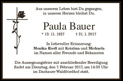Die Aussegnungsfeier mit anschließender Beerdigung ist am Dienstag, den 7. Februar 2017, um 14:30 Uhr im Dachauer Waldfriedhof.