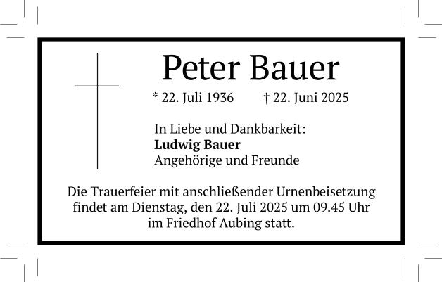 Die Trauerfeier mit anschließender Urnenbeisetzung findet am Dienstag, den 22. Juli 2025 um 09.45 Uhr im Friedhof Aubing statt.