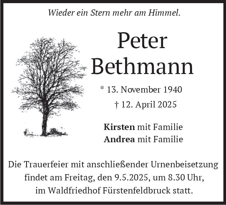 Wir trauern um Herrn Peter Bethmann * 13.11.1940 † 12.04.2025 |
