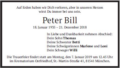 Trauerfeier am Montag, dem 7. Januar 2019, um 12:45 Uhr im Münchner Krematorium Ostfriedhof