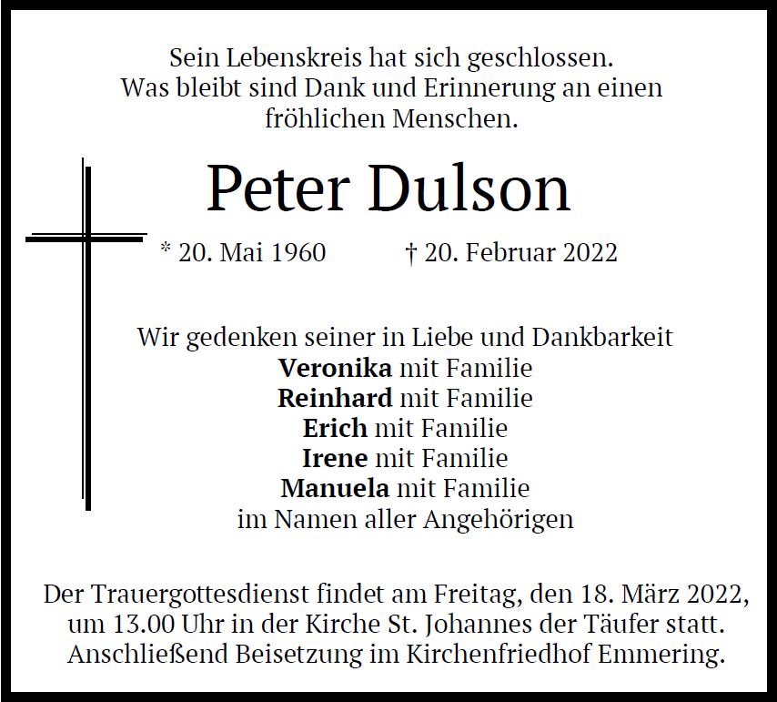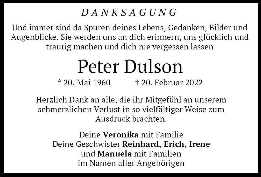 Wir trauern um Herrn Peter Dulson * 20.05.1960 † 20.02.2022 |