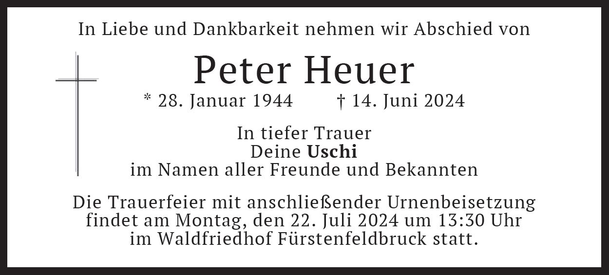 Die Trauerfeier mit anschließender Urnenbeisetzung findet am Montag, den 22. Juli 2024 um 13:30 Uhr im Waldfriedhof Fürstenfeldbruck statt. |