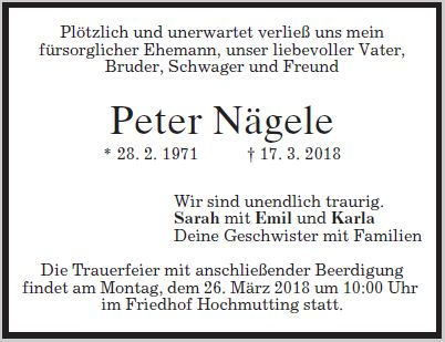 Trauerfeier mit anschließender Beerdigung am Montag, dem 26. März 2018, um 10:00 Uhr im Friedhof Hochmutting