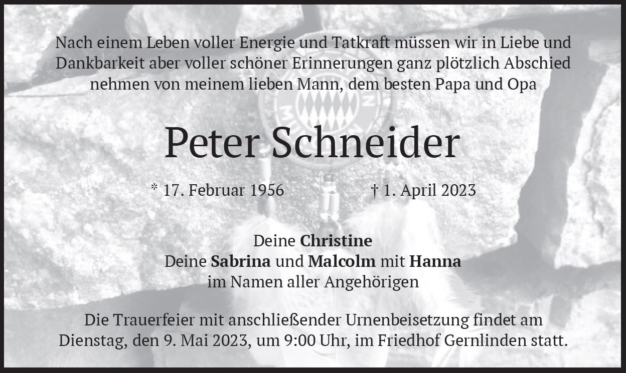 Die Trauerfeier mit anschließender Urnenbeisetzung findet am Dienstag, den 9. Mai 2023 um 9:00 Uhr im Friedhof Gernlinden statt.
