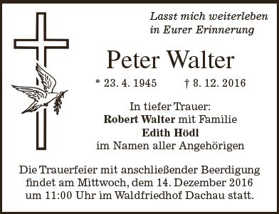 Trauerfeier mit anschließender Beerdigung am Mittwoch, dem 14. Dezember 2016, um 11:00 Uhr im Dachauer Waldfriedhof