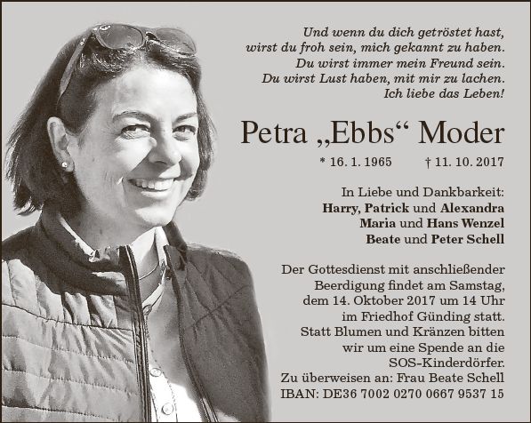 Gottesdienst mit anschließender Beerdigung am Samstag, dem 14. Oktober 2017, um 14:00 Uhr im Friedhof Günding