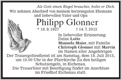 Der Trauergottesdienst ist am Samstag, dem 18. Juli 2015, um 10:00 Uhr in der Pfarrkirche Zu den heiligen Schutzengeln, in Eichenau |