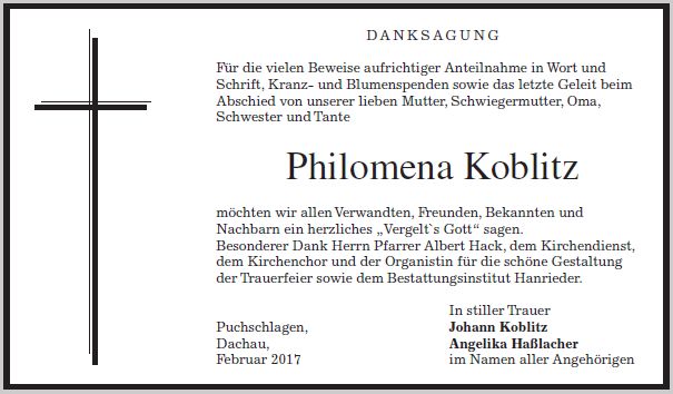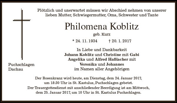 Wir trauern um Frau Philomena Koblitz geb. Kurz Hausfrau * 24.11.1934 † 20.01.2017 |