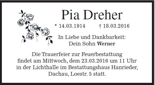 Trauerfeier am Mittwoch, dem 23. März 2016, um 11:00 Uhr in der Lichthalle im Bestattungshaus Hanrieder
