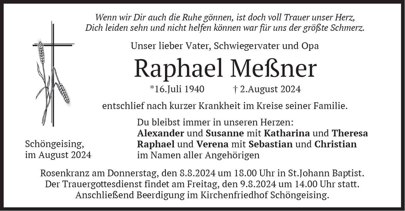 Wir trauern um Herrn Raphael Meßner * 16.07.1940 † 02.08.2024 |