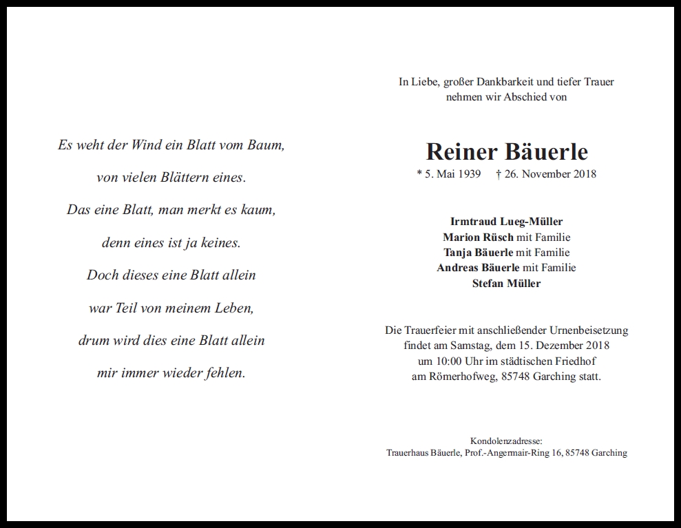 Wir trauern um Herrn Reiner Bäuerle Ingenieur * 05.05.1939 † 26.11.2018 |