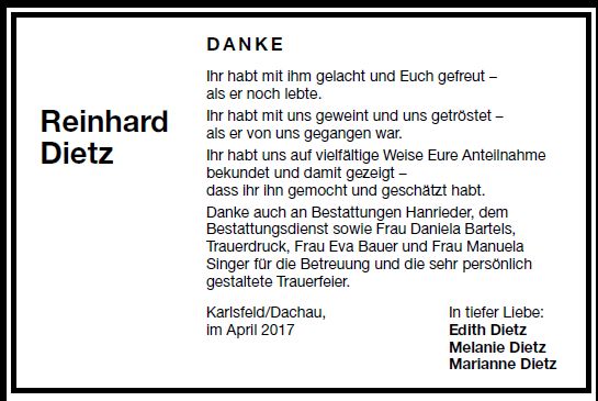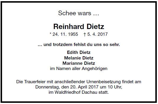 Die Trauerfeier mit anschließender Urnenbeisetzung findet am Donnerstag, den 20. April 2017 um 10 Uhr, im Waldfriedhof Dachau statt. |