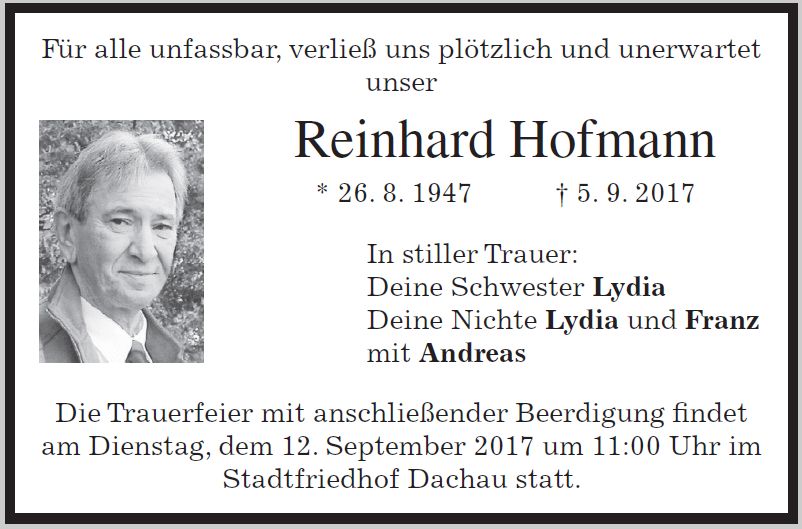 Trauerfeier mit anschließender Beerdigung am Dienstag, dem 12. September 2017, um 11:00 Uhr im Dachauer Stadtfriedhof |