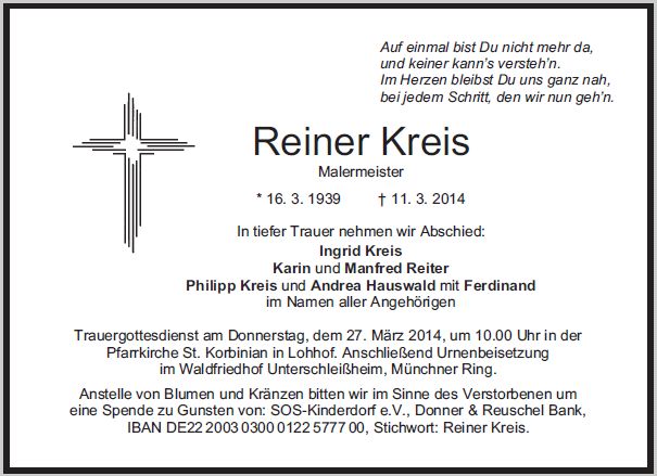 Gottesdienst am Donnerstag, dem 27. März 2014, um 10:00 Uhr in St. Korbinian Beerdigung am Donnerstag, dem 27. März 2014, um 11:00 Uhr im Waldfriedhof Unterschleißheim