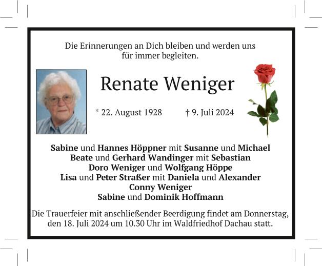 Wir trauern um Frau Renate Weniger geb. Stark * 22.08.1928 † 09.07.2024 |