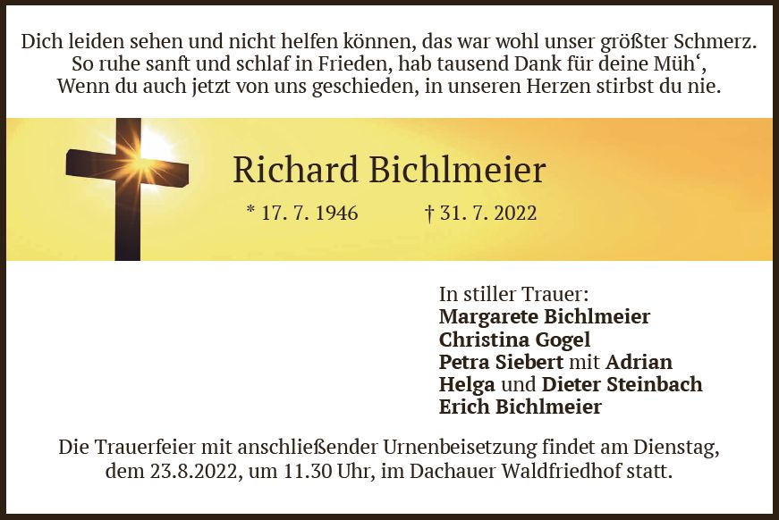 Trauerfeier mit anschließender Urnenbeisetzung am Dienstag, dem 23. August 2022, um 11:30 Uhr im Dachauer Waldfriedhof.