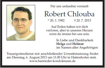 Wir trauern um Herrn Robert Chlouba Arbeiter * 20.01.1982 † 20.07.2013 |