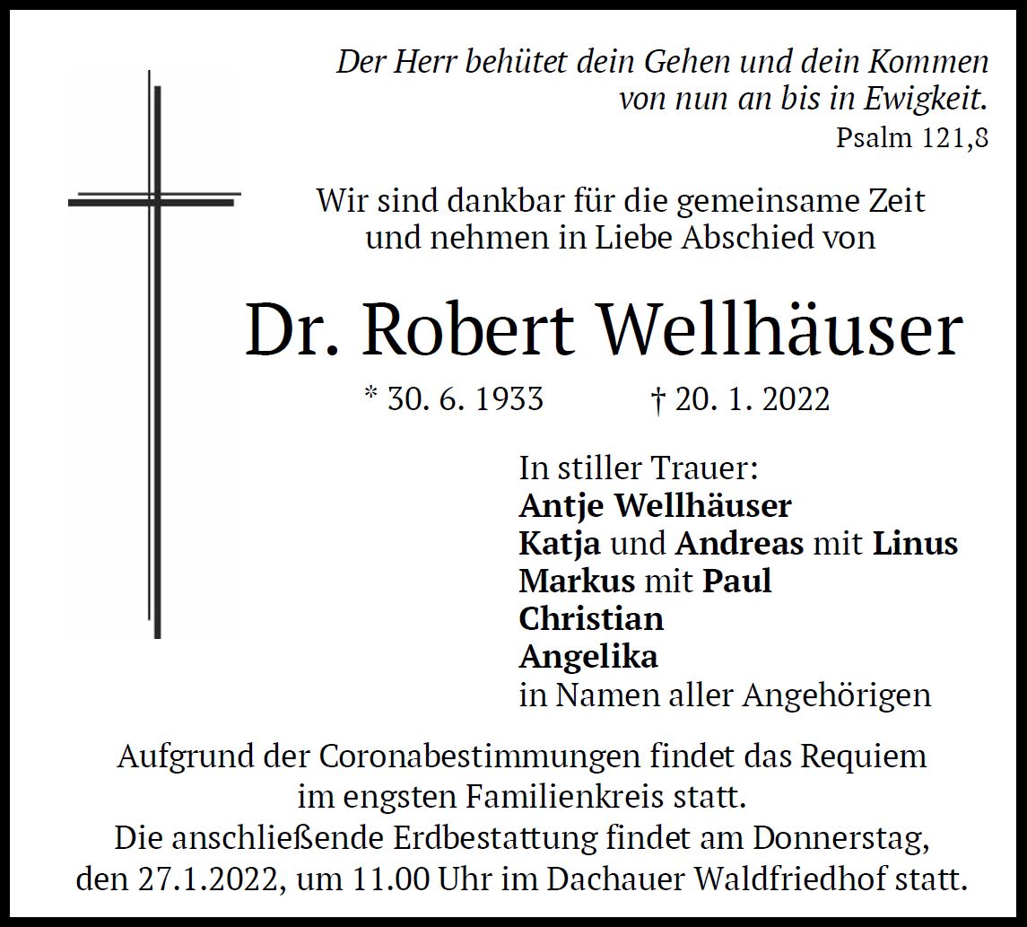 Aufgrund der aktuellen Coronabestimmungen findet der Gottesdienst im engsten Familienkreis statt. Beerdigung am Donnerstag, dem 27. Januar 2022, um 11:00 Uhr im Dachauer Waldfriedhof.