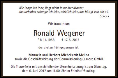 Wir trauern um Herrn Ronald Wegener geb. Wegener Geschäftsführer * 08.11.1958 † 17.05.2017 |