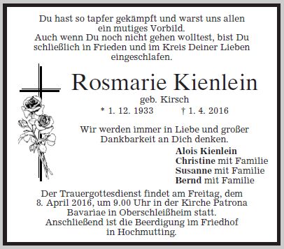 Gottesdienst am Freitag, dem 8. April 2016, um 09:00 Uhr in Patrona Bavariae in Oberschleißheim Beerdigung am Freitag, dem 8. April 2016, um 10:00 Uhr im Hochmutting