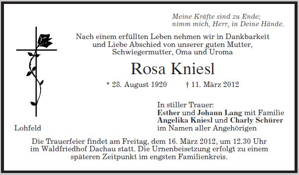 Trauerfeier am Freitag, dem 16. März 2012, um 12:30 Uhr im Waldfriedhof Dachau. Die Urnenbeisetzung erfolgt zu einem späteren Zeitpunkt im engsten Familienkreis.
