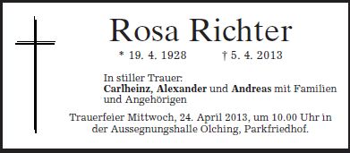Die Trauerfeier findet am 24.4.2013 um 10 Uhr im Parkfriedhof in Olching statt.