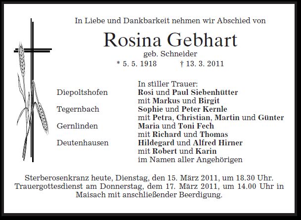 Gottesdienst am Donnerstag, dem 17. März 2011, um 14:00 Uhr in St. Vitus Beerdigung am Donnerstag, dem 17. März 2011, um 14:30 Uhr im Maisacher Friedhof