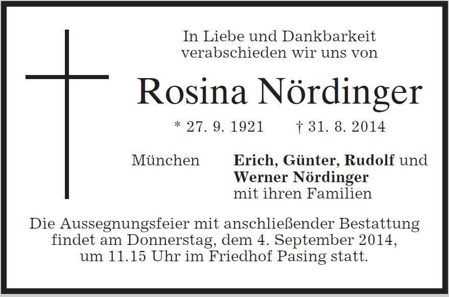 Beerdigung am Donnerstag, dem 4. September 2014, um 11:15 Uhr im Friedhof München Pasing